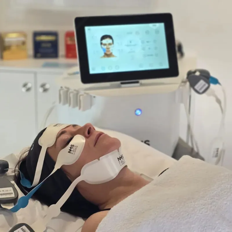 NMS® Face uses precise Neuro-Muscular pulses to strengthen facial muscles while deep Radiofrequency gently heats the dermis to stimulate natural collagen production.